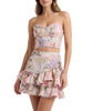 • Crafted from soft floral-printed fabric, its layered ruffle design is enhanced with embroidered lace trims that add an artisanal and sophisticated touch