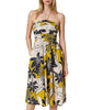 Printed poplin midi dress with tropical-inspired print, featuring a bandeau top with pleated front and tie-up laces around the neck with tassel tips. Designed with elastic stitching at the back and inner silicone trim for a secure fit, plus a gathered skirt with handy side pockets and a heart-shaped metal logo at the back. Ideal for elevating daytime looks or special occasions when paired with heels and a clutch.