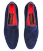 These midnight blue velvet slippers with black leather soles feature a bright red quilted satin lining making them extra comfortable and a tonal rope binding. They add a regal touch to any outfit.