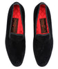 These plain classic black cotton velvet slippers with black leather soles feature a bright red quilted satin lining making them extra comfortable and a tonal rope binding. They add a regal touch to any outfit.