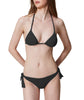 Black bikini set featuring a triangle bikini top with delicate pearl trims and a coordinating adjustable tie-side thong bottom. The top is designed with a classic triangle silhouette, thin adjustable straps, and elegant pearl detailing, while the bottom offers minimal coverage with side ties for a customizable fit. Finished with subtle heart-shaped metal logo details for a refined swimwear look — ideal for beach days, poolside lounging, and resort wear.