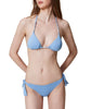 Chic bikini set featuring a triangle bikini top with pearl trims and a coordinating adjustable tie-side thong bottom. The top offers a classic triangle silhouette with delicate pearl accents and thin adjustable straps, while the bottom has minimal coverage and side ties for a custom fit. Finished with subtle heart-shaped metal logo details for signature styling — perfect for beach days, poolside lounging, or resort looks.