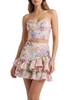 • Crafted from soft floral-printed fabric, its layered ruffle design is enhanced with embroidered lace trims that add an artisanal and sophisticated touch