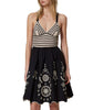 Short dress featuring a striped crochet bodice with triangle cups and a lightweight poplin skirt with contrasting broderie anglaise. Designed with thin shoulder straps, a low waist with inset elastic and gathering for a flared fit, and a scalloped hem with embroidered detail. Fully lined in soft muslin with a heart-shaped logo plate at the back — perfect for summer evenings or resort styling.