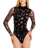 Mei One Piece is a long-sleeve swimsuit with sheer mesh sleeves, a high neckline, and a placement print filled with small surreal-inspired motifs.