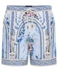 • The print wanders into an ethereal world of oceanic blues framed by intricate mosaic archways laced in delicate florals